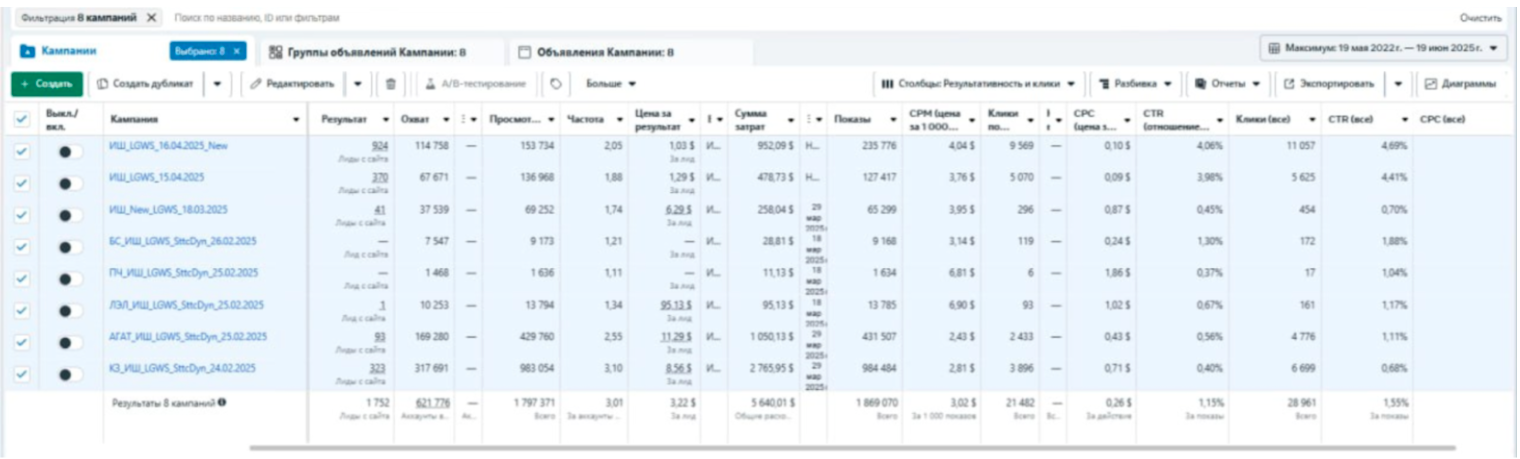 - Масштабирование — увеличили бюджеты на успешные кампании и отключили неэффективные