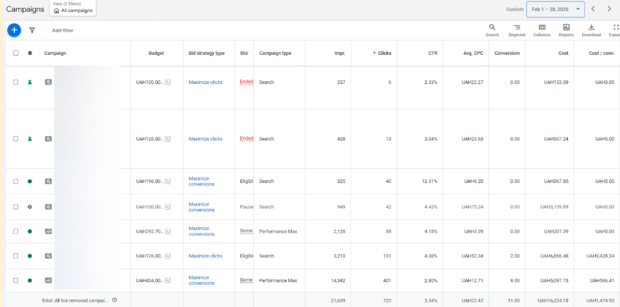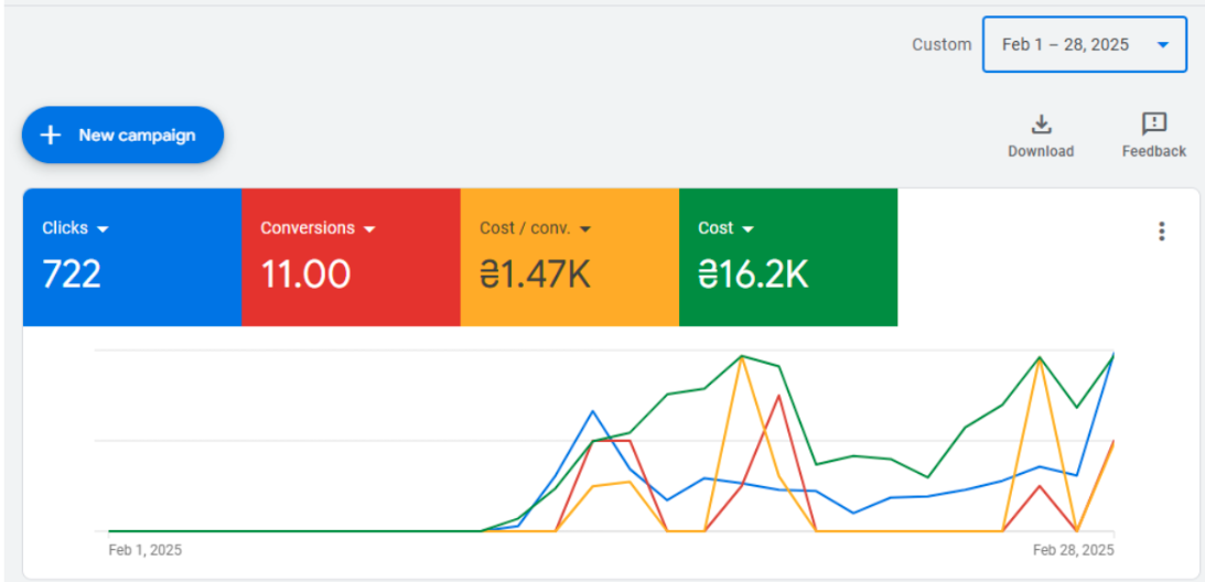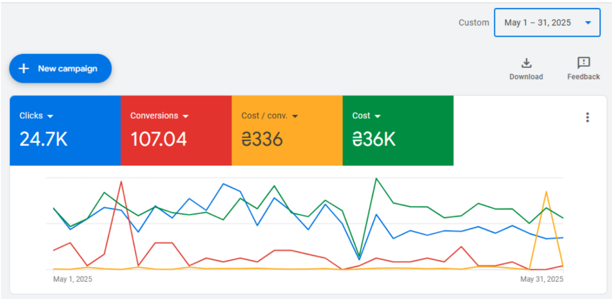 На старте аккаунт находился в фазе обучения и стабилизации. Использовались Search и Performance Max кампании. Конверсии были, но стоимость лида оставалась высокой — типичная ситуация для криптониши на раннем этапе, особенно при ограниченном бюджете и отсутствии накопленных данных.