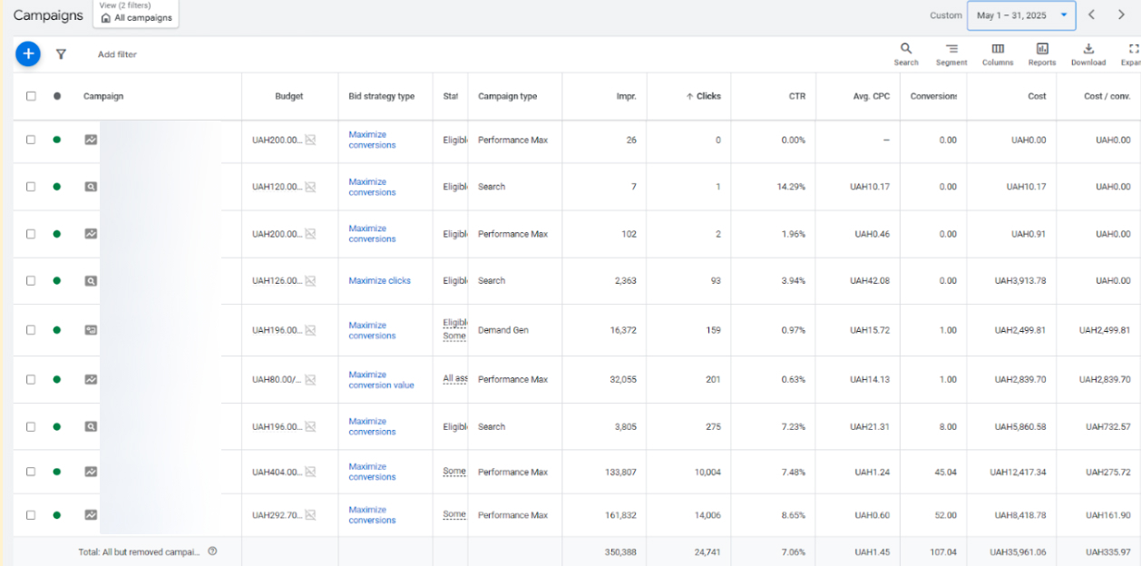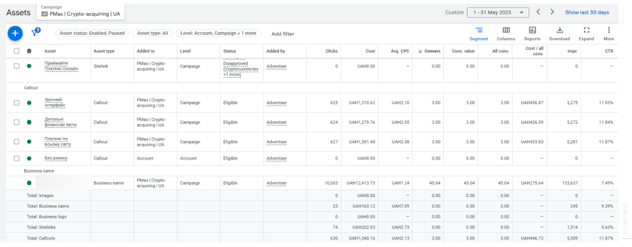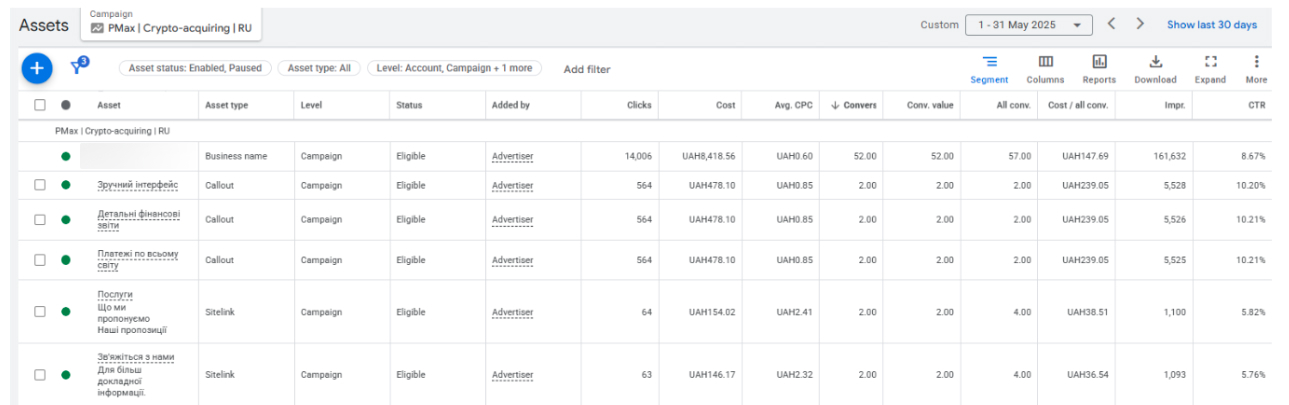 Результаты — Украина (PMax | Crypto-acquiring | UA, май 2025)