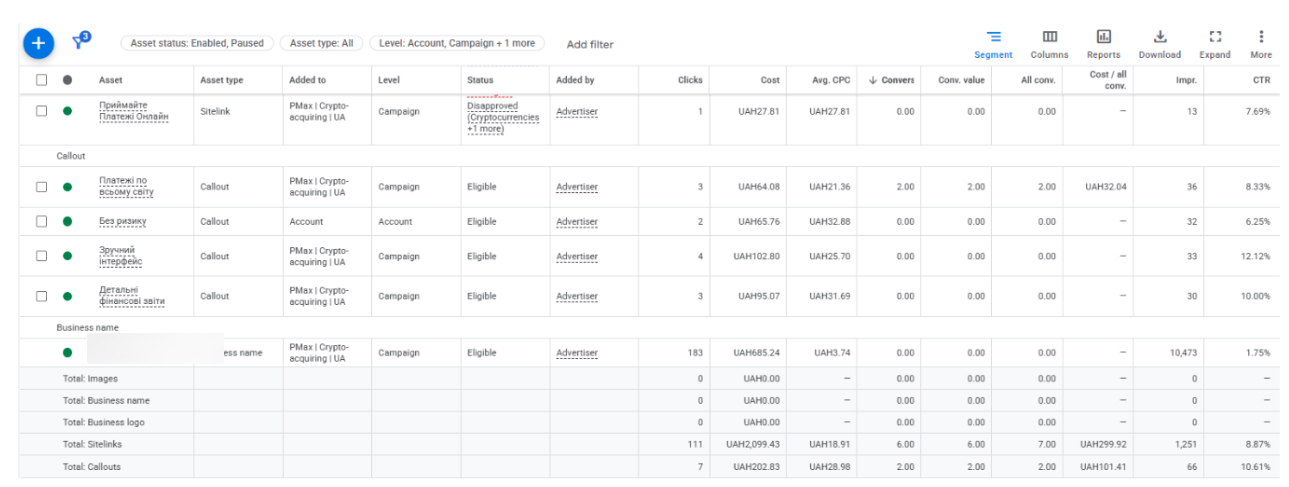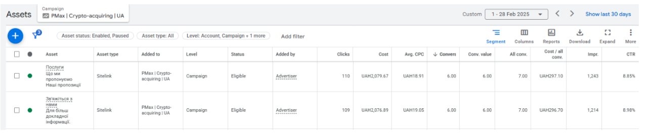 - Общие расходы по sitelinks: ≈ 4 156 грн