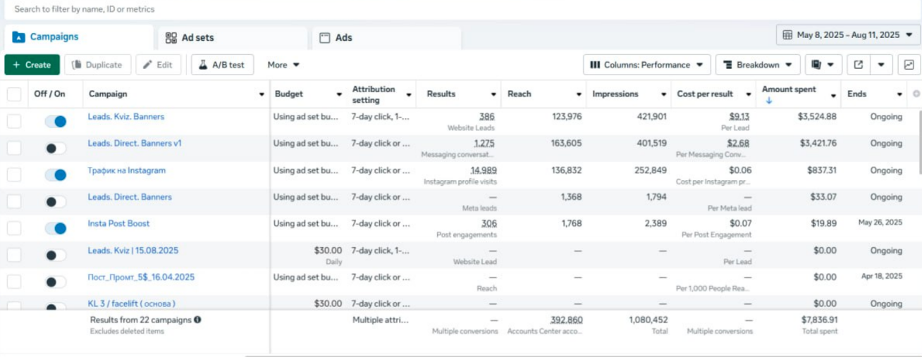 Клиент не новичок в рекламе: до старта сотрудничества уже были попытки продвигаться через Facebook/Instagram, но результат оказался нестабильным: