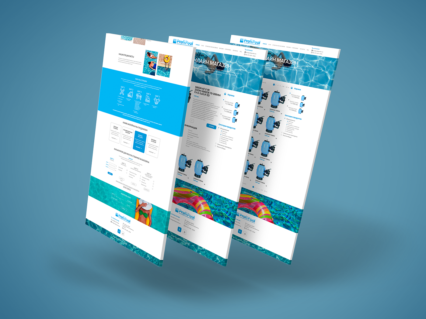 При разработке сайта учли пожелания клиента. Структуру сайта разработали простой и лаконичной для лучшего восприятия посетителем сайта. Разработали логичные переходы информативных блоков, а также поддержали минималистический характер сайта. Сайт по принципу Landing page легко воспринимается и предоставляет нужную информацию для посетителя сайта.За основу дизайна взяли направление бизнеса. Для разработки дизайн сайта дизайнеры использовали синие и бирюзовые оттенки, которые ассоциируются с бассейном. Использование в дизайне дополнительных фотографий, где отображена бирюзовая вода бассейна - будет подогревать желание посетителя сайта определиться с выбором. Также использовали иконки и блоки для оформления информации.
