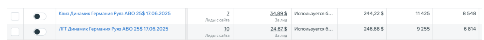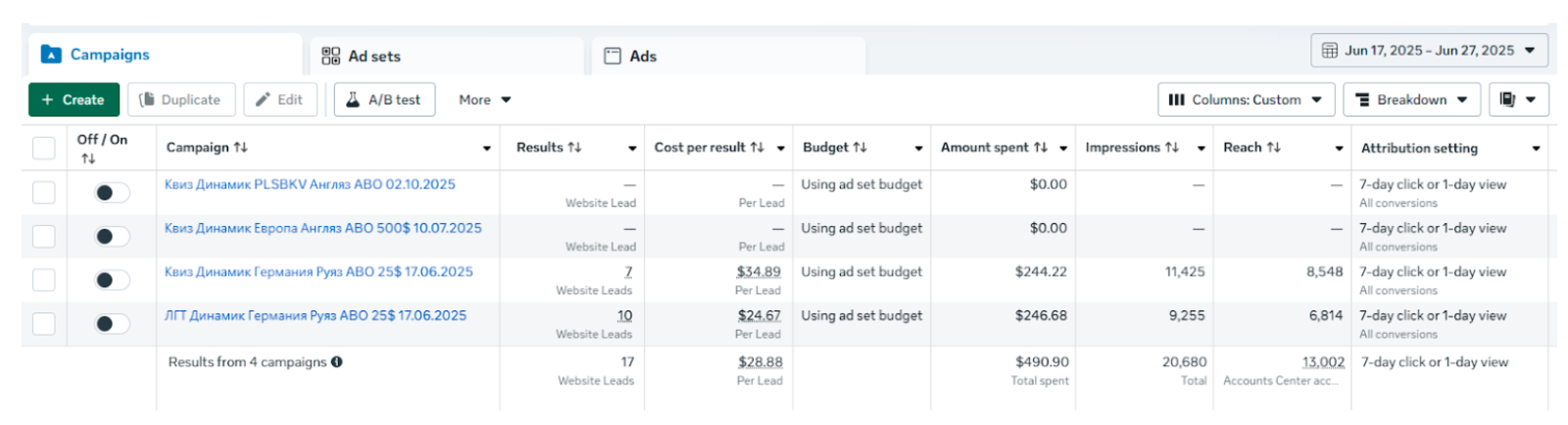 Скрин фиксирует рабочую лидогенерацию в нише недвижимости через Meta Ads с использованием квиз-воронок и динамических связок. Две активные кампании дали 100% всех лидов, при CPL в диапазоне $24–35, что укладывается в рыночную норму для EU-GEO в недвижимости.