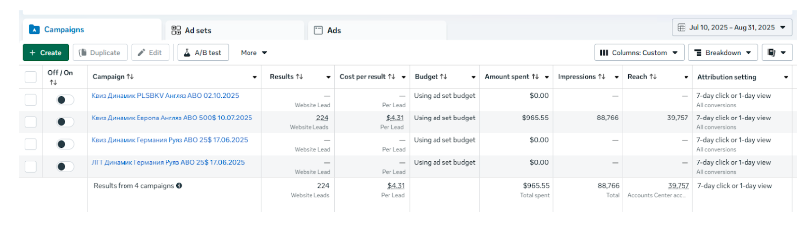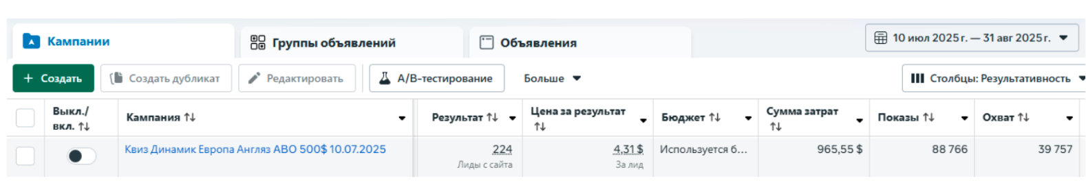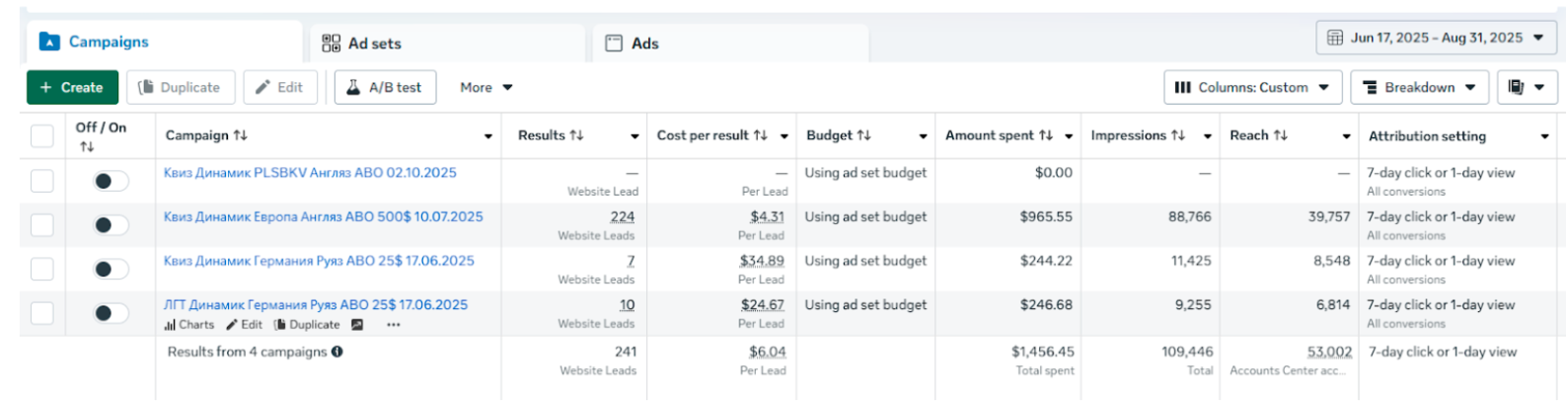 За период работы реклама принесла 241 заявку при среднем CPL $6.04, а ключевая европейская связка дала 224 лида с CPL $4.31. При охвате более 53 000 человек и 109 000+ показов кампании масштабировались без резкого роста стоимости лида и без потери качества заявок.
