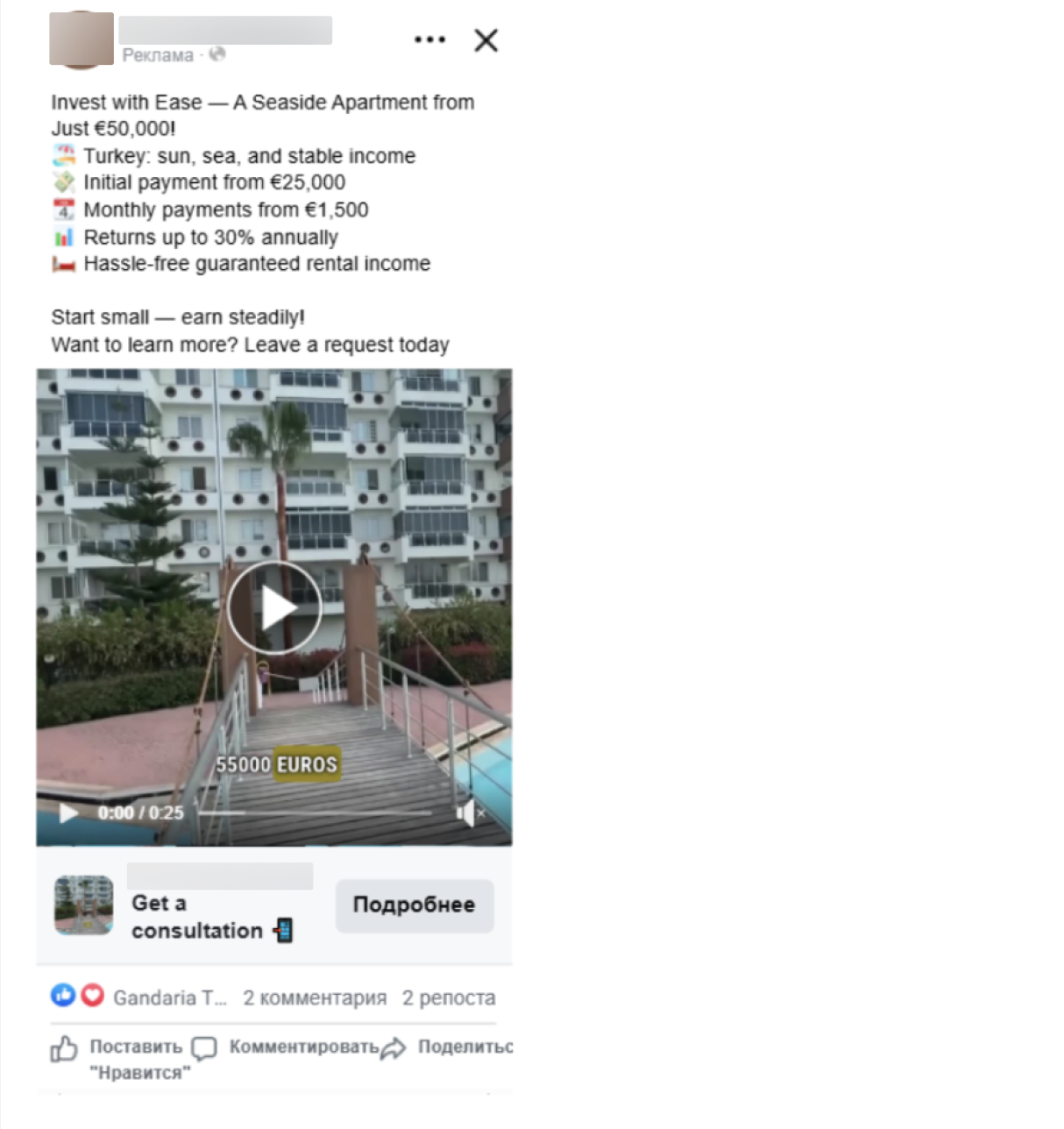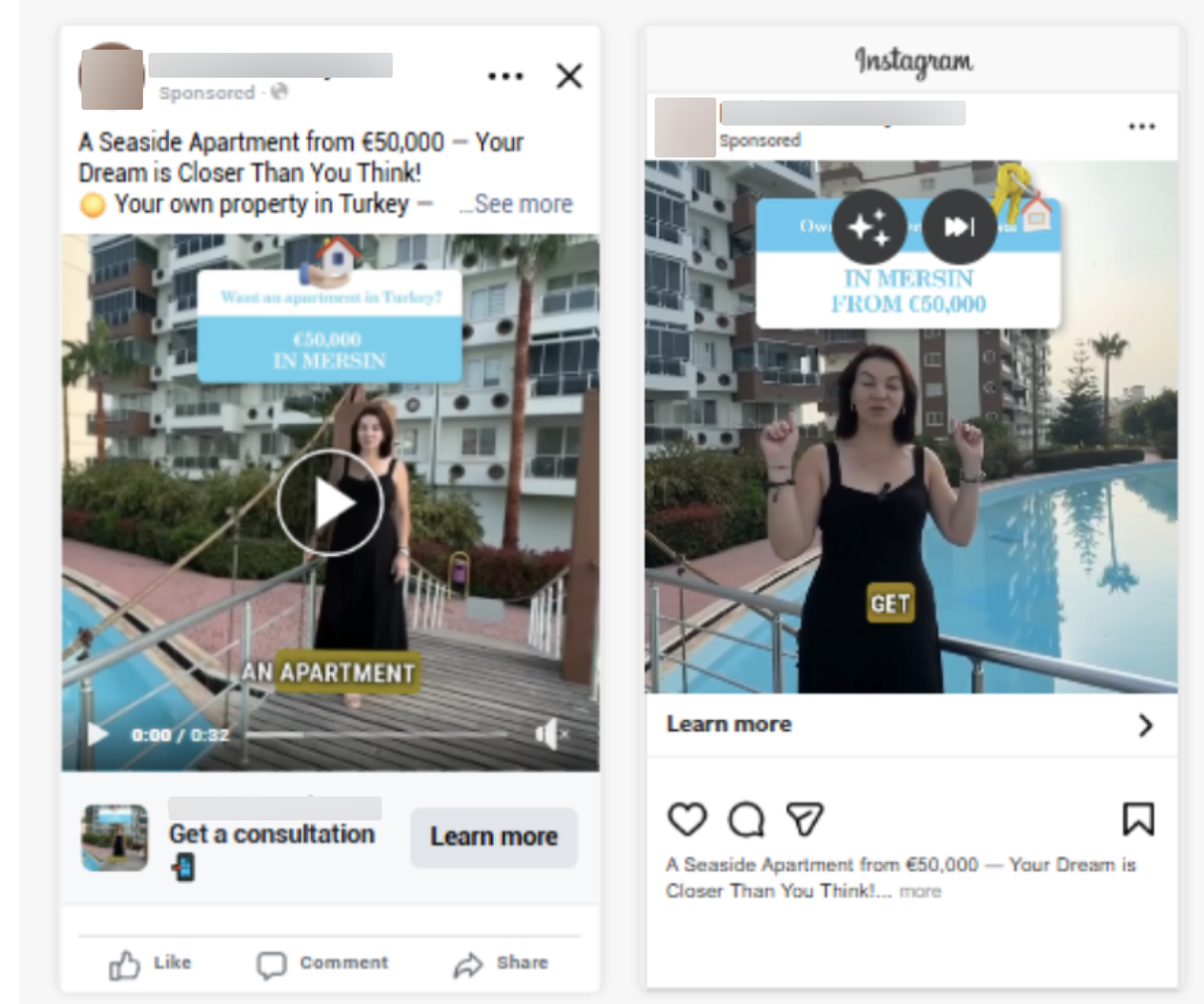 Лучше всего отработал видео-креатив с живым человеком на объекте недвижимости. В кадре — эксперт, который напрямую обращается к зрителю и показывает реальный комплекс у моря. Чёткий оффер в первые секунды (апартаменты от €50 000), визуальный контекст локации и простой CTA (Learn more / Get a consultation) обеспечили высокий интерес и стабильные заявки.