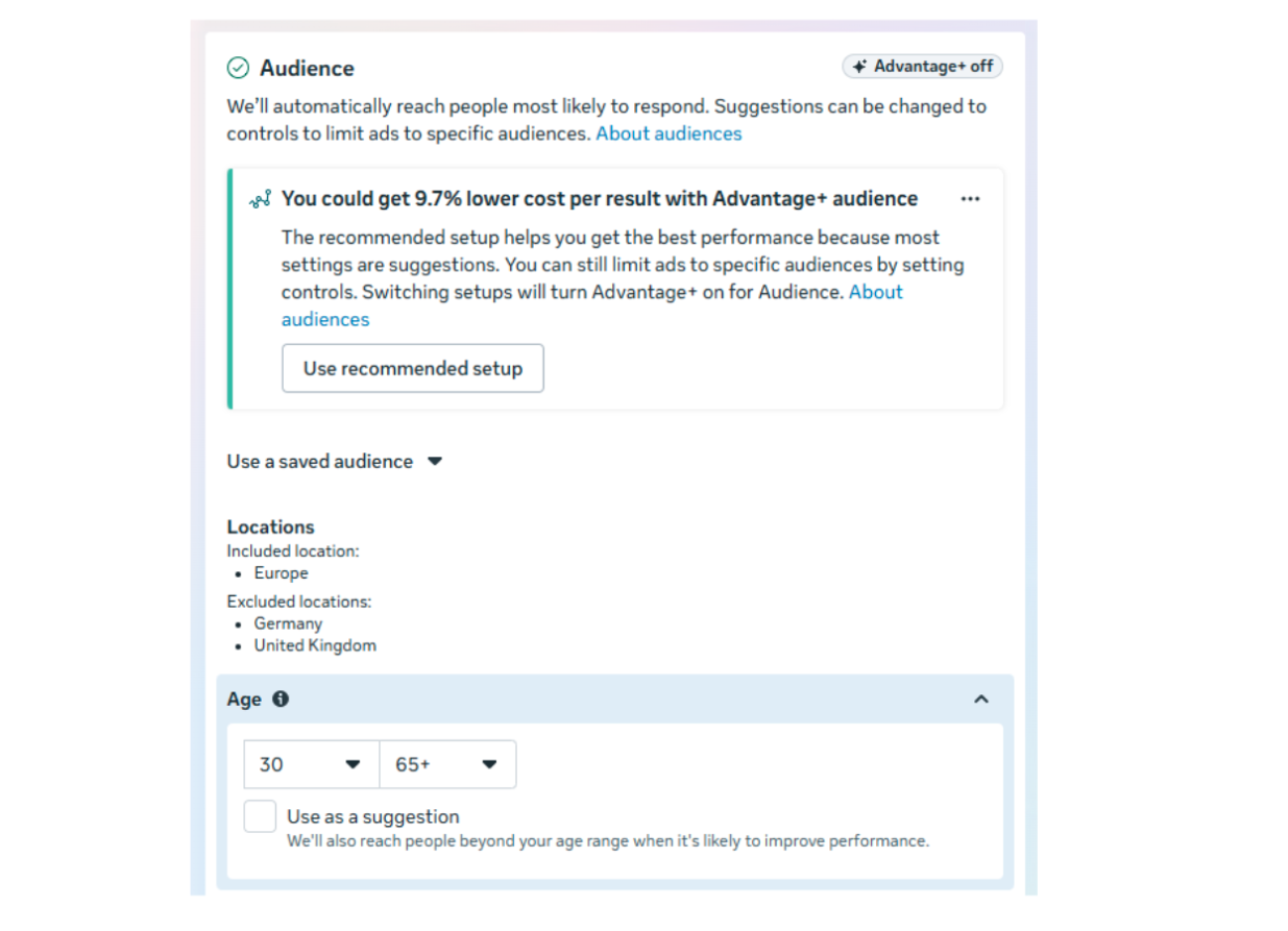 В кампаниях использовалась Advantage+ аудитория Meta с автоматической оптимизацией под пользователей, наиболее склонных к конверсии. География — Европа, при этом Германия и Великобритания исключены из показов. Возрастной диапазон — 30–65+, с разрешением системе выходить за рамки диапазона, если это повышает эффективность. Такой подход позволил снизить стоимость результата и масштабировать охват без ручного дробления аудиторий.