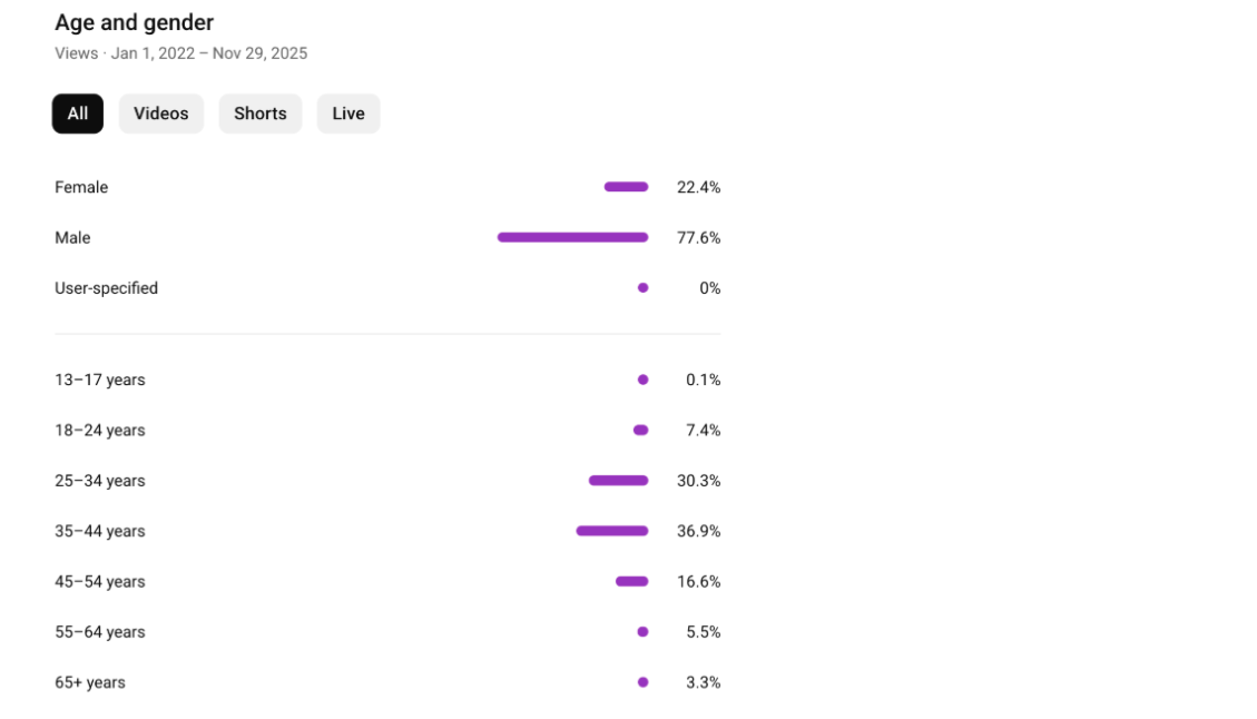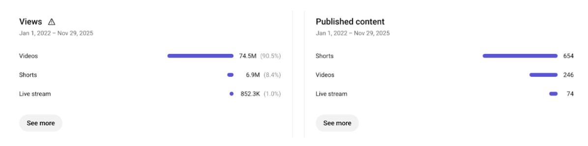 - Shorts — включили с середины 2022-го как дополнительный охватный слой, но фокус оставался на длинных видео и эфирах.