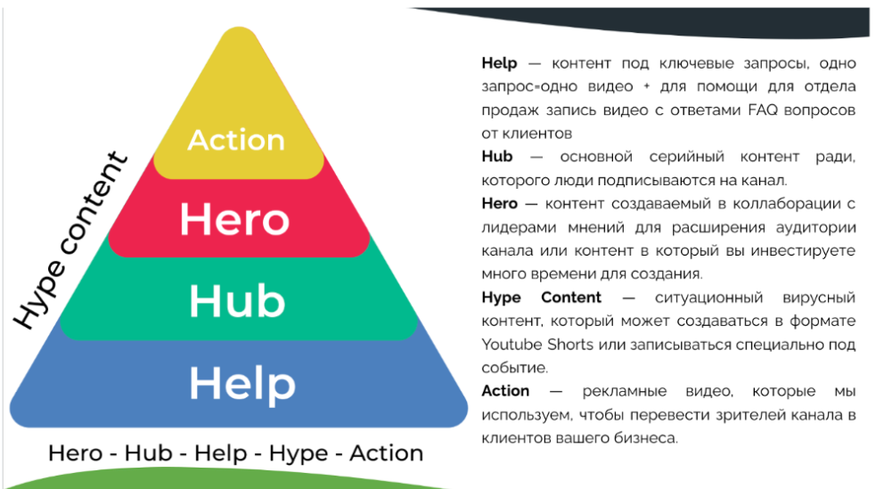 Мы выстроили стратегию по модели Hero–Hub–Help–Hype–Action: