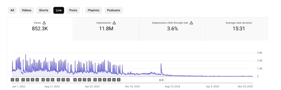 Live: 852.3K просмотров, 15:31 среднее удержание