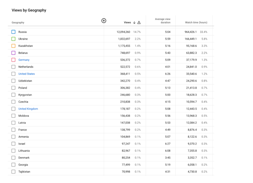 Канал на русском языке, поэтому Россия давала наибольшее количество просмотров. Но с ней работа не велась. Базовая аудитория - Европа и США.