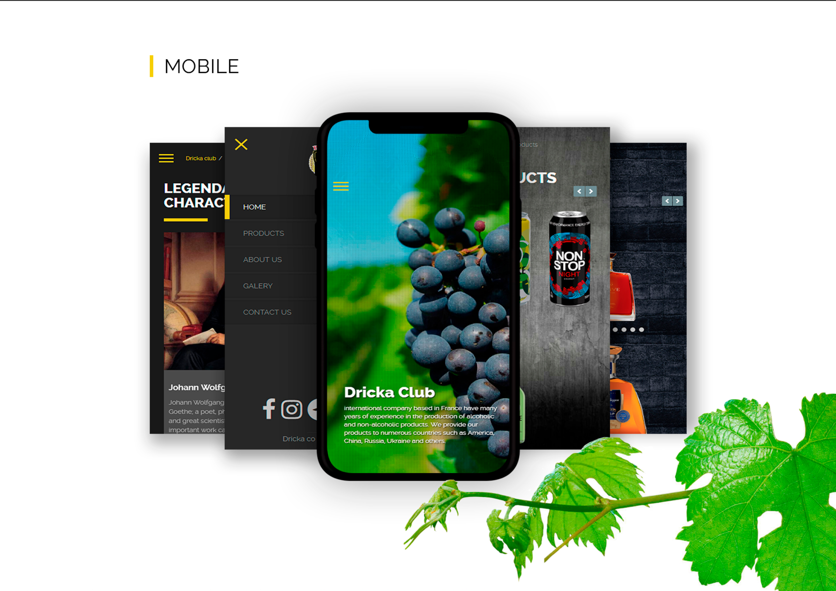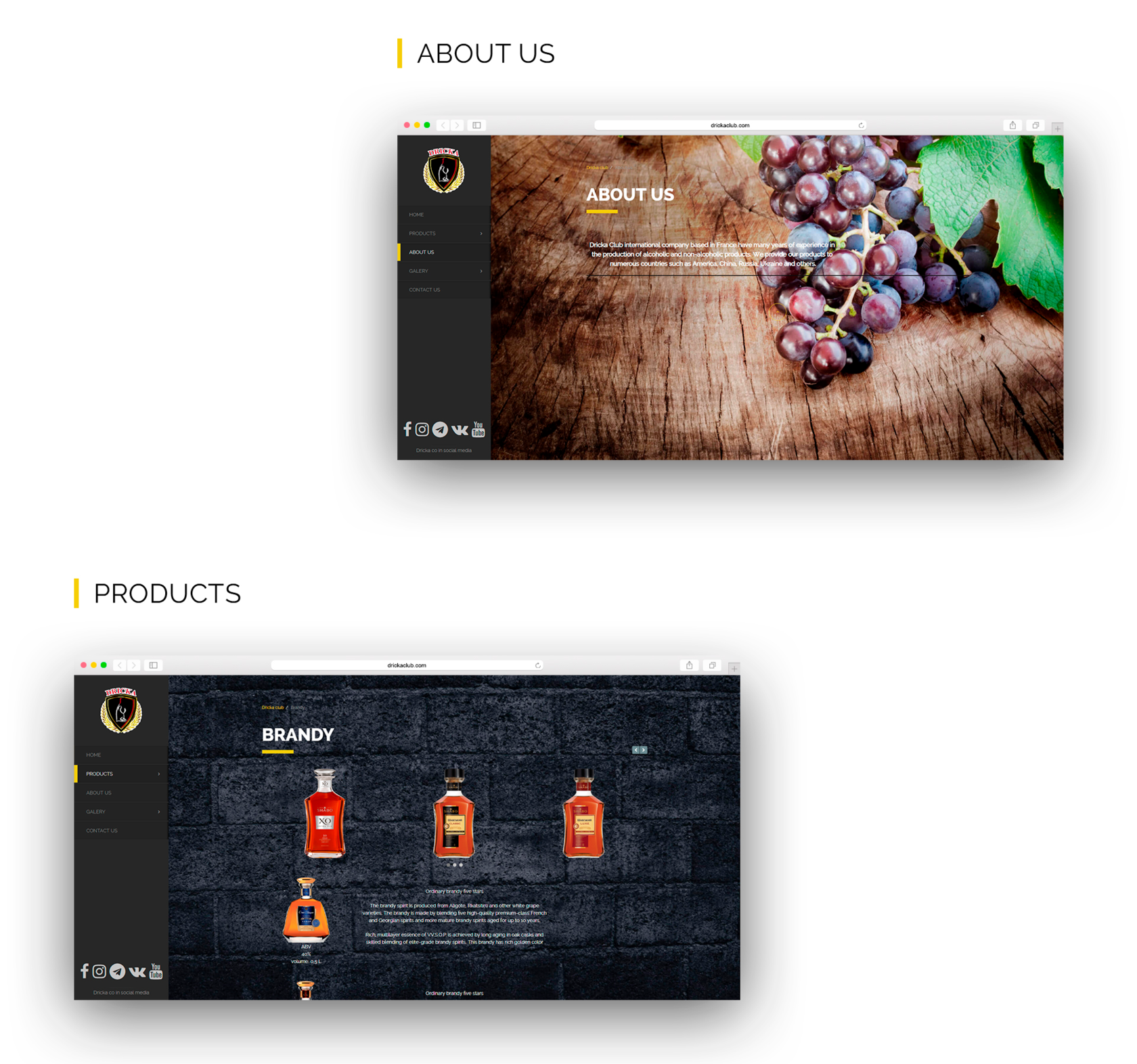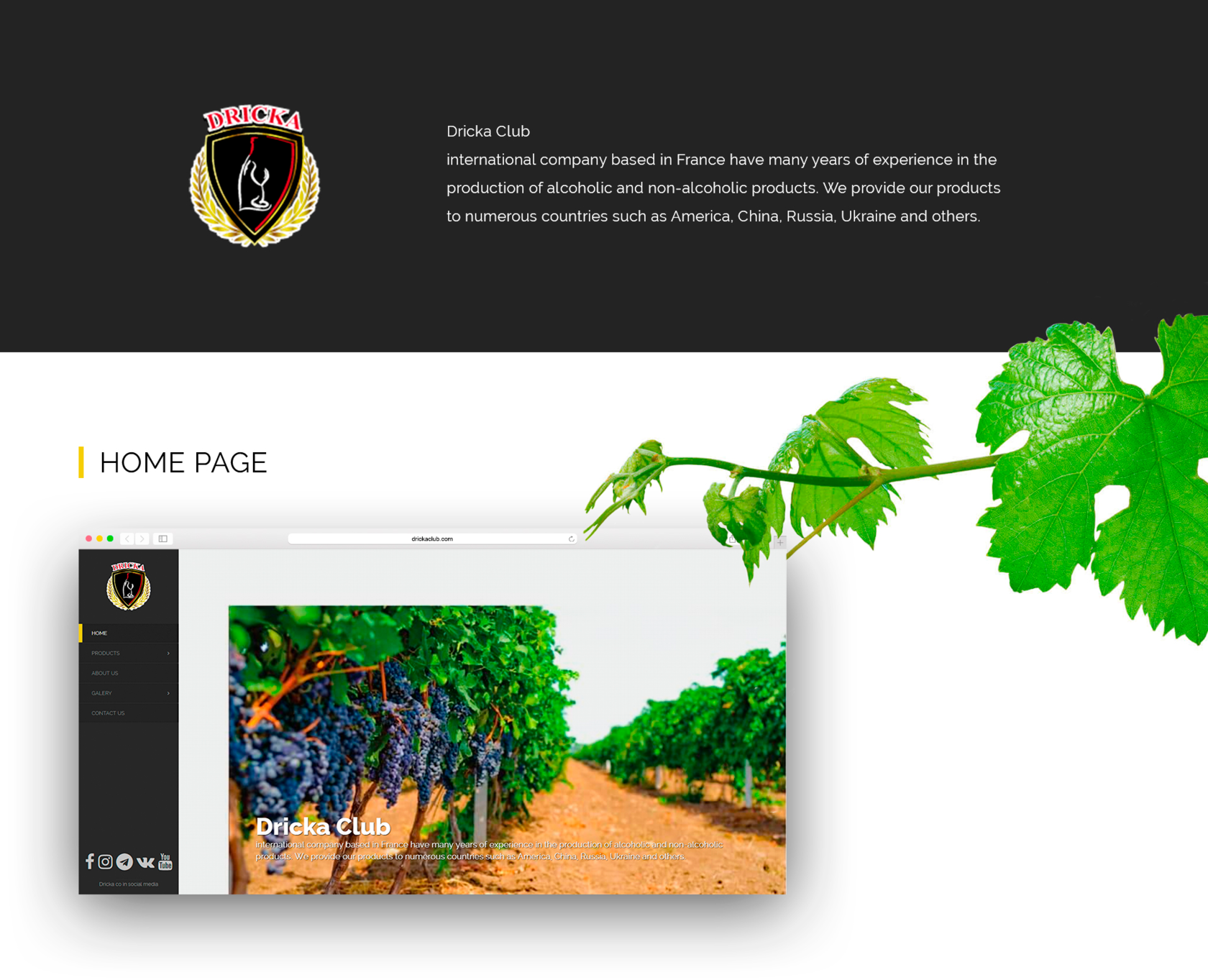 Исходя из того, что продукция, которая выпускается под брендом Dricka Club имеет древнюю историю (вина, бренди, шампанское) мы решили оформить сайт в виде подвалов, в которых выдерживаются благородные напитки. На сайте отдельный блок страниц отведен для презентации продукции с её подробным описанием.