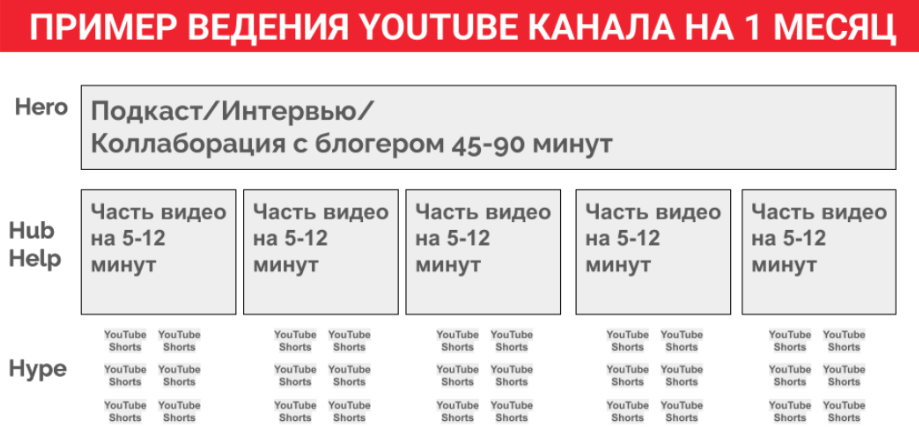 Данная схема показывает оптимальную модель упаковки и масштабирования контента на YouTube за 1 месяц, где один базовый контент-юнит раскладывается на несколько уровней охвата и прогрева.