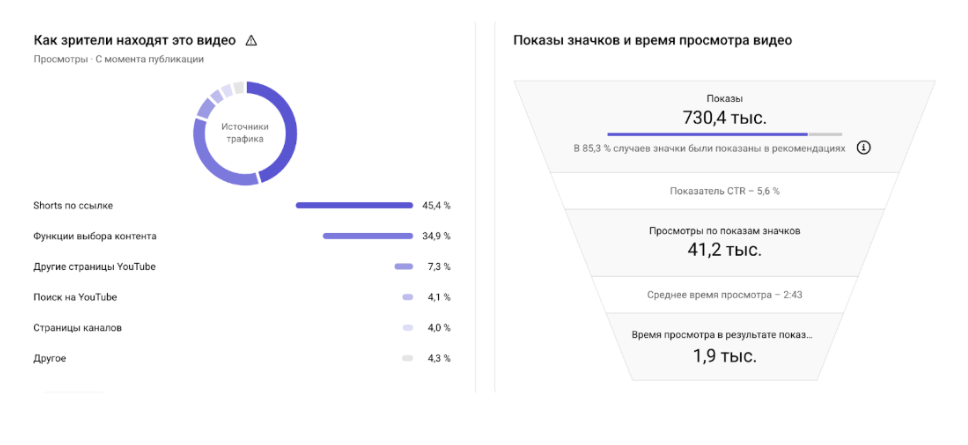 Источники трафика: 34% — функция выбора контента, 45% — по ссылке из коротких видео