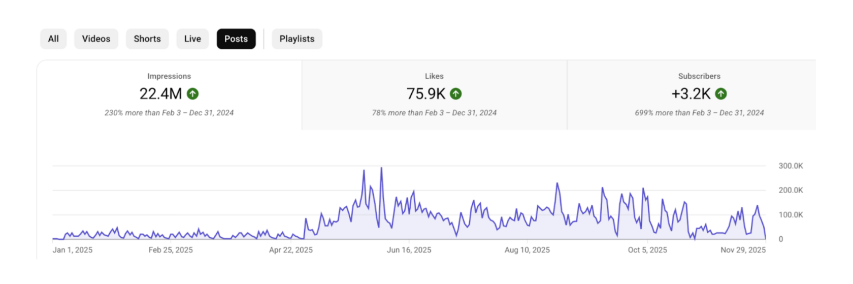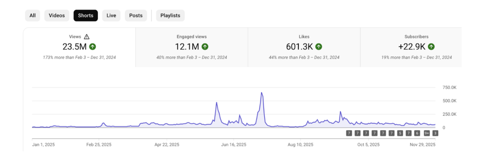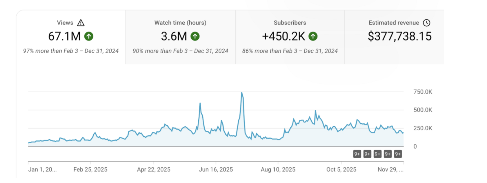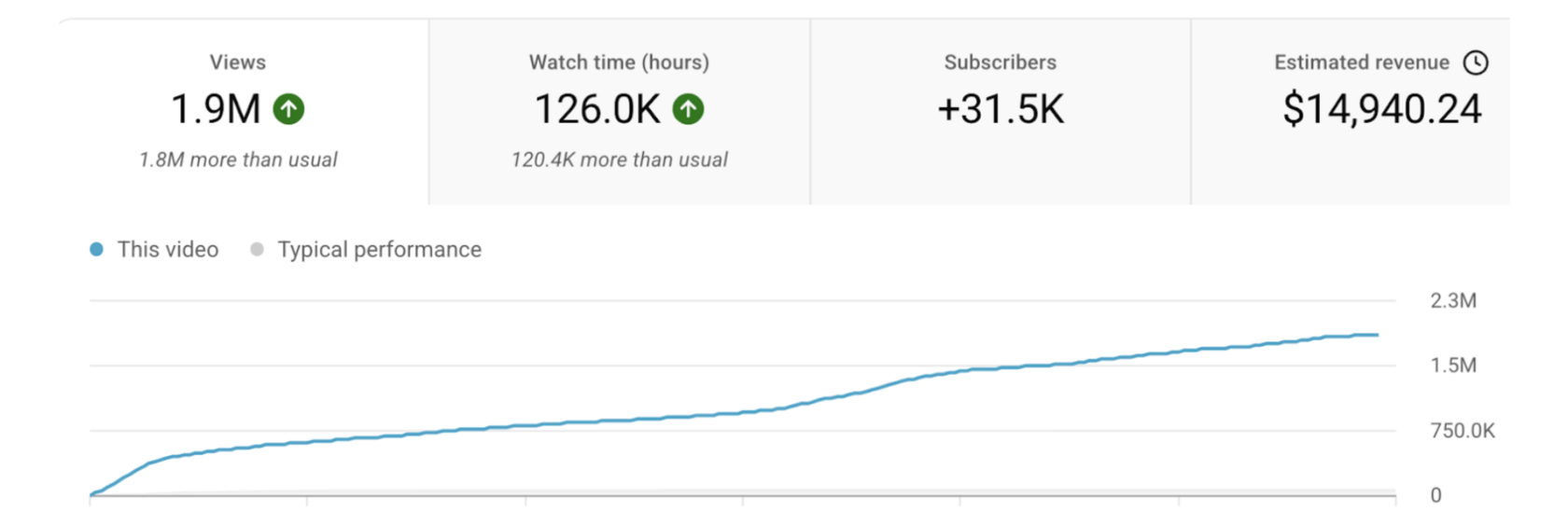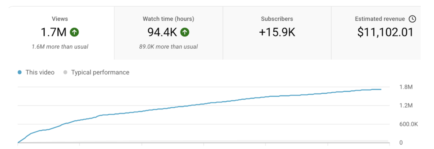 Просмотры, часы просмотра, подписчики — всё выросло почти вдвое. Это крайне редкий результат для канала с аудиторией более 2 млн подписчиков, где темпы роста обычно сильно замедляются.