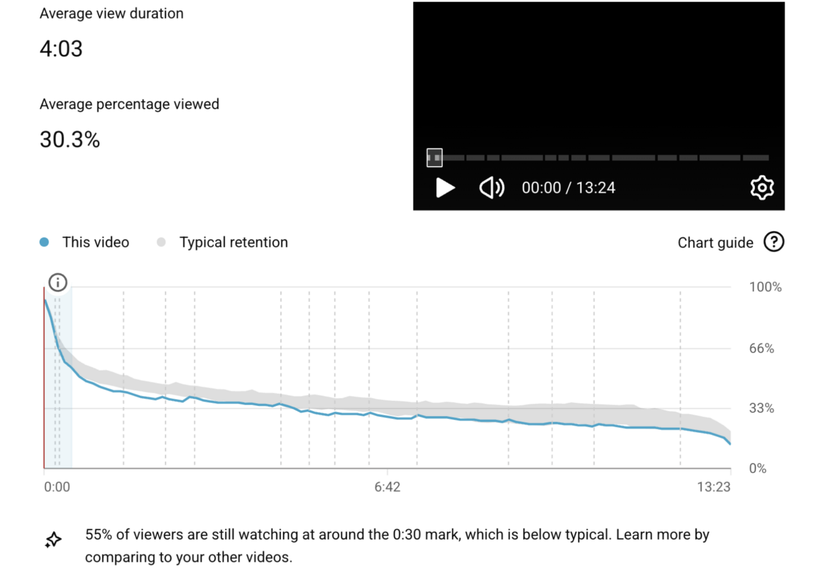 - 55% зрителей остаются после 30-й секунды