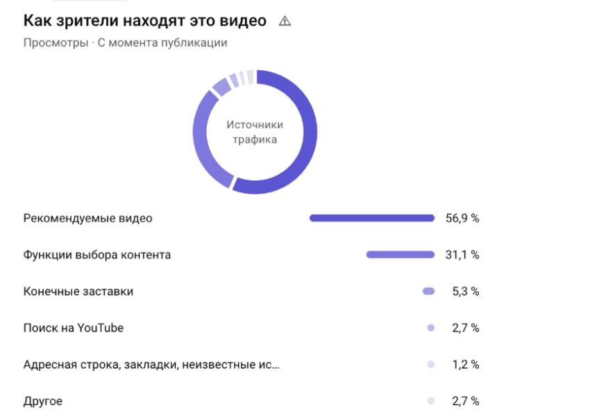Источники трафика: 57% — рекомендованные видео, 31% — функция выбора контента