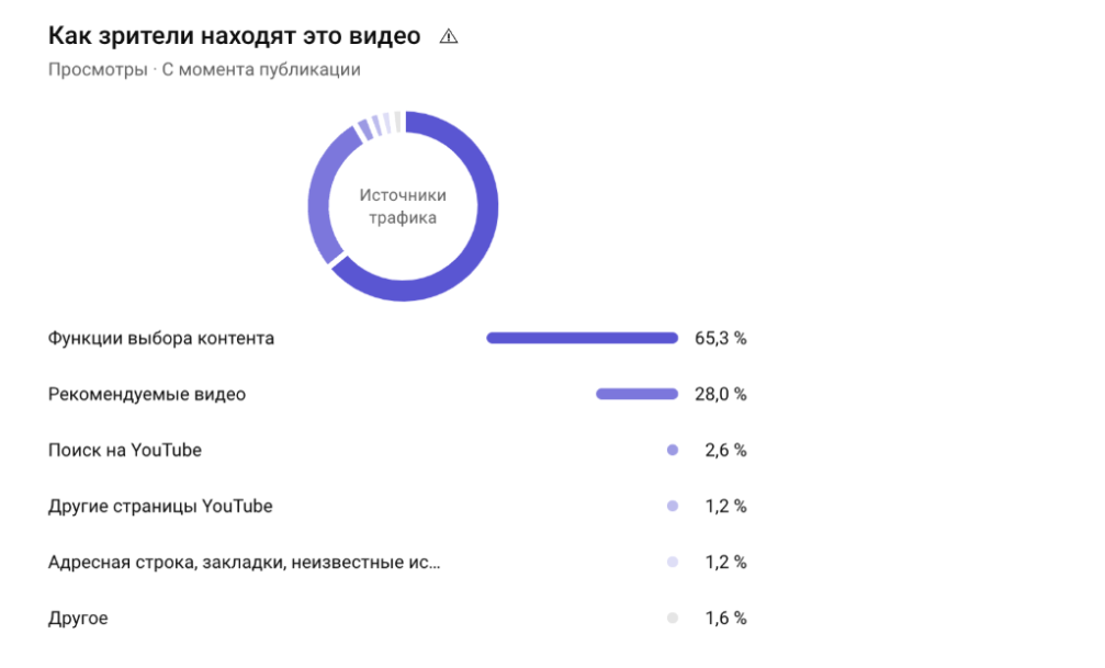 Источники трафика: 65% — функция выбора контента, 28% — рекомендованные видео