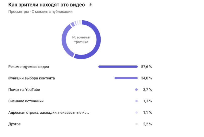 Источники трафика: 57% — рекомендованные видео, 34% — функция выбора контента