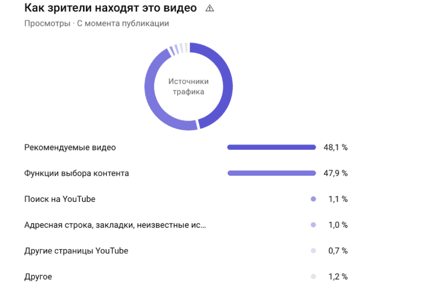 Источники трафика: 48% — рекомендованные видео, 47% — функция выбора контента